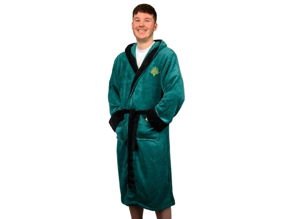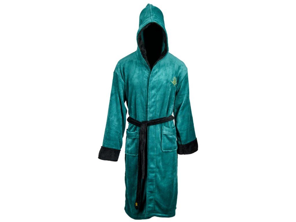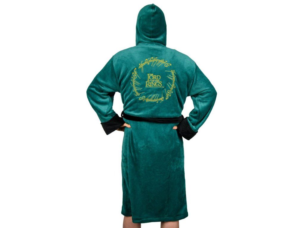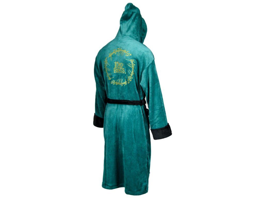 Kvalitní zelený pánský župan s kapucí pro všechny milovníky filmové série Pán prstenů. Autentický design inspirovaný elfy s vyšívaným erbem na hrudi. Župan disponuje dvěmi předními kapsami a páskem. Župan je vyroben z velice kvalitního plyšového materiálu, který je pohodlný jak při nošení, tak na dotek.