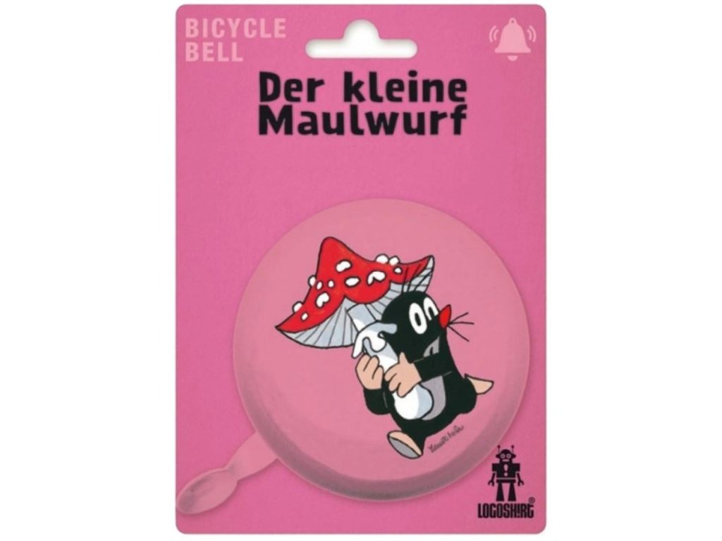 Zvonek na kolo růžové barvy se motivem postavičky Krtečka s muchomůrkou.